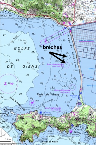 - ce point est le plus vulnérable de la plage en raison d'un profil sous marin défavorable (existence d'une brèche et de plusieurs trous sous marins, visibles sur la carte bathymétrique ci dessous) qui provoque le déferlement de la houle très près de la plage et non plus au large, comme ailleurs. La houle la plus forte doit se former au large et l’angle par lequel elle peut atteindre la côte sans se briser sur les caps environnants est celui de la houle de sud ouest, qui se concentre ainsi naturellement dans le secteur Nord de la plage de l’Almanarre.